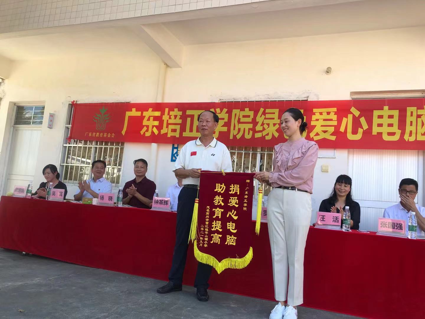 廣東培正學院資產管理辦公室資產管理員羅慧向平山鋪小學贈送“綠色愛心電腦教室”牌匾,平山鋪小學張國強校長接收牌匾