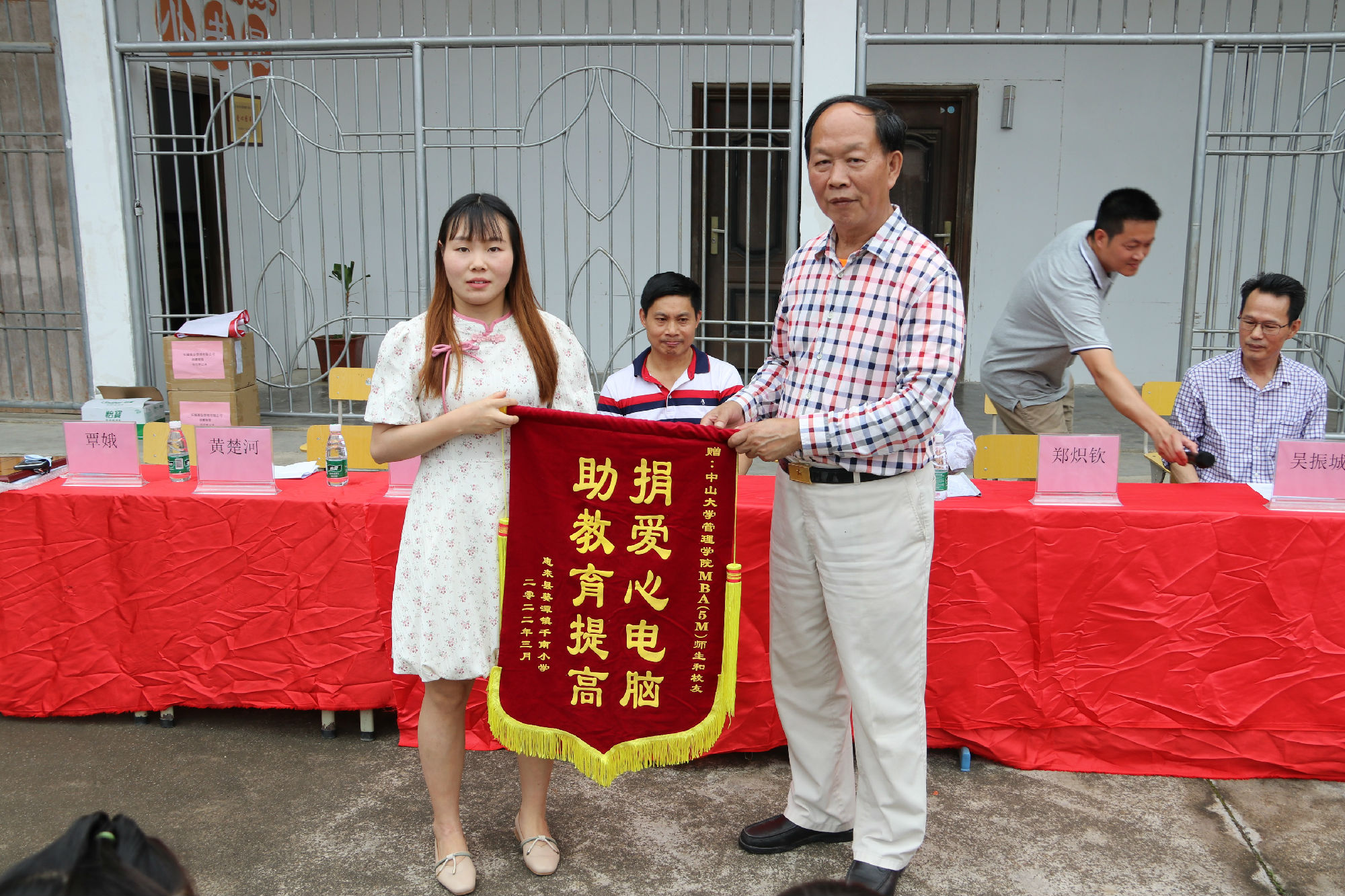 廣東省教育基金會鄭熾欽秘書長向中山大學管理學院 MBA(5M)師生和校友贈送錦旗,覃娥代中山大學管理學院 MBA(5M)師生和校友接收錦旗