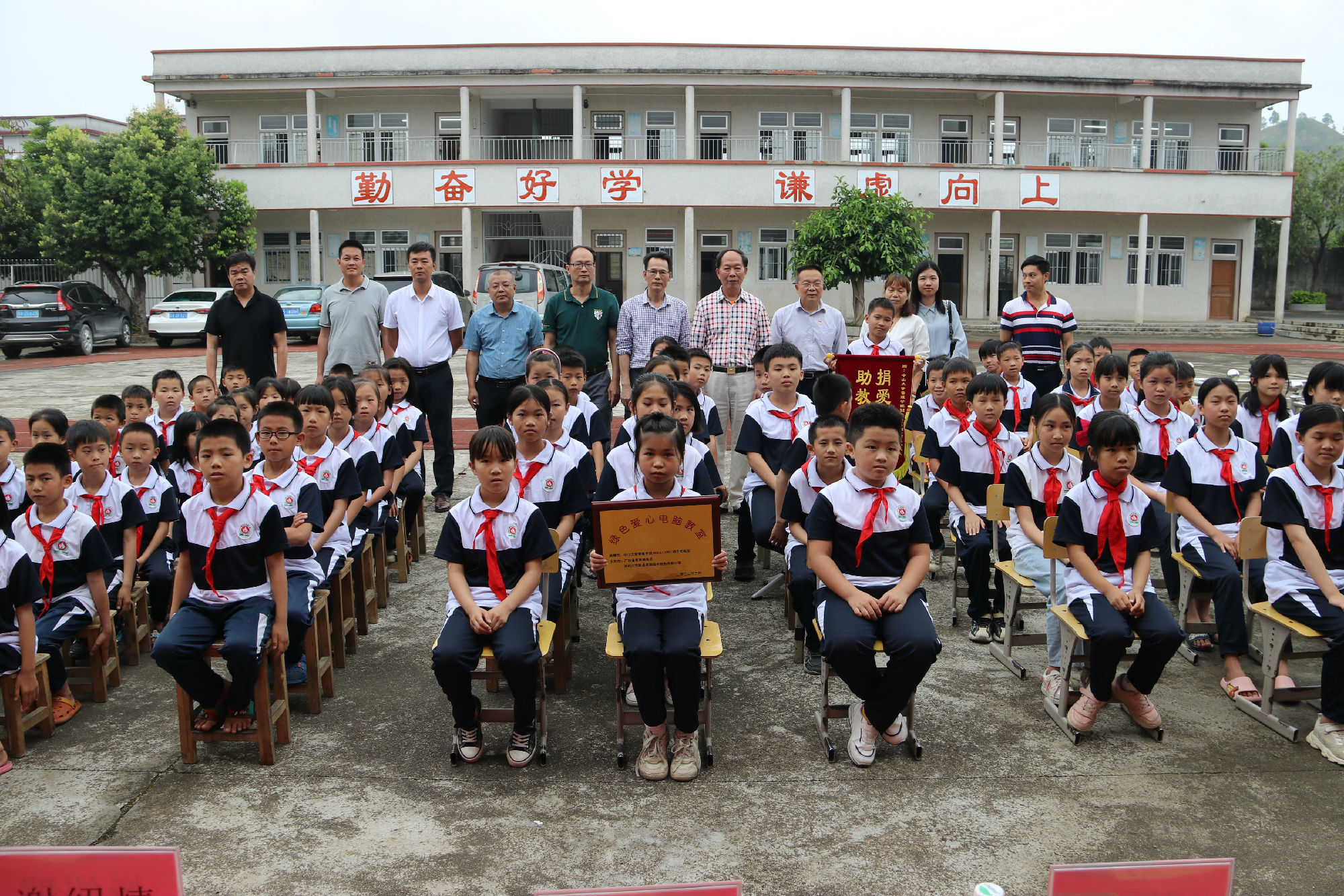 廣東省教育基金會謝紹熺副秘書長向千南小學贈送“綠色愛心電腦教室”牌匾,千南小學黃楚河校長接收牌匾