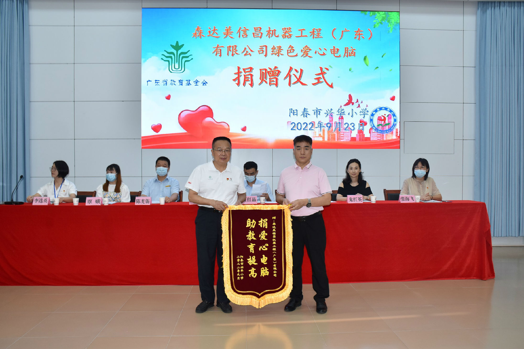 廣東省教育基金會謝紹熺副秘書長向森達美信昌機器工程(廣東)有限公司贈送錦旗,森達美信昌機器工程(廣東)有限公司劉祥經理接收錦旗