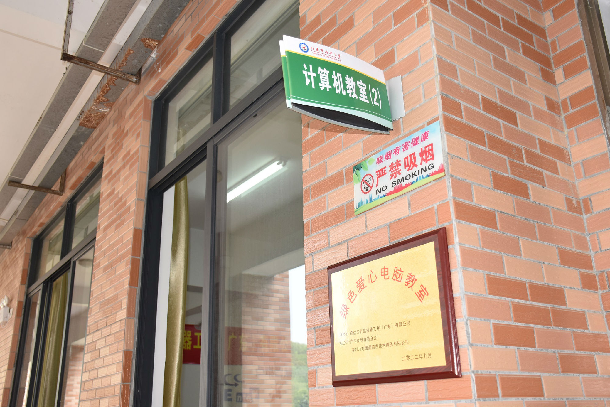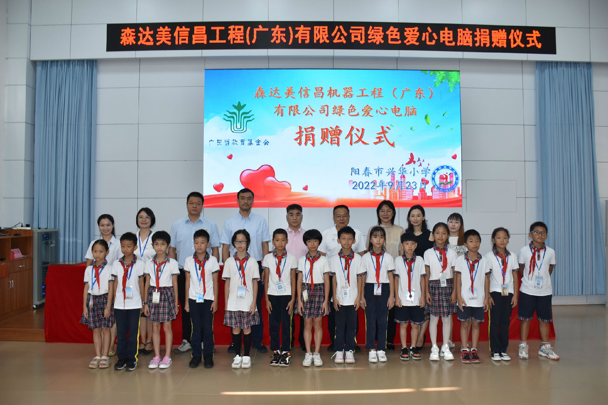 森達美信昌機器工程(廣東)有限公司員工關系經理劉祥向興華小學贈送“綠色愛心電腦教室”牌匾,興華小學李選英校長接收牌匾