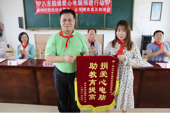 廣東省教育基金會鄭熾欽副理事長兼秘書長向馬頭鎮中心小學贈送“綠色愛心電腦教 室”牌匾,陳計明校長接收牌匾。