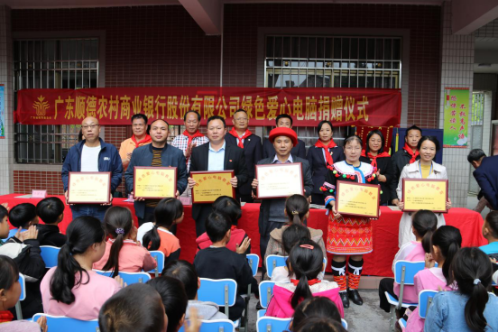廣東順德農(nóng)村商業(yè)銀行股份有限公司麥樹(shù)銘主席、蘇健權(quán)副主任、李艷紅經(jīng)理向渦水鎮(zhèn)中心學(xué)校、龍翔小學(xué)、東芒小學(xué)、福華小學(xué)、三排小學(xué)、油嶺小學(xué)贈(zèng)送“綠色愛(ài)心電腦教室”牌匾,6所受贈(zèng)學(xué)校校長(zhǎng)接收牌匾。