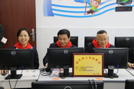 廣東順德農(nóng)村商業(yè)銀行股份有限公司麥樹(shù)銘主席、蘇健權(quán)副主任、李艷紅經(jīng)理檢查“綠色愛(ài)心電腦”設(shè)備情況,體驗(yàn)電腦質(zhì)量。
